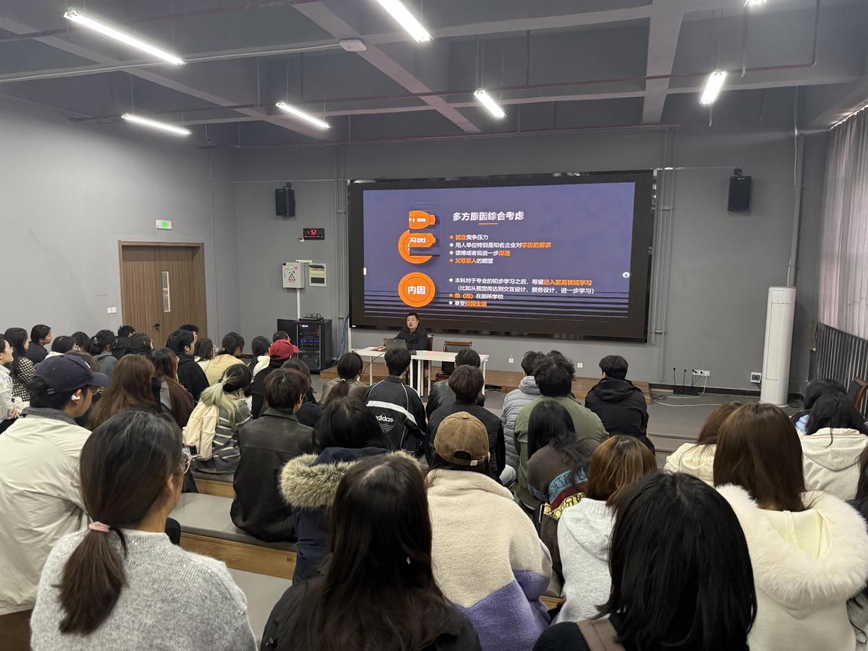 讲座中,三位老师围绕考研核心要点展开分享:顾行健老师分别从时间节点提醒、服务保障资源、近三年录取数据分析及建议几方面展开,详细介绍了公司和公司对考研员工的服务保障,鼓励同学们积极报考,通过往届数据分析,详解介绍了公司考研报考和录取的情况,提醒同学们合理选择院校,不盲目报考;苏旭老师则结合设计学科特性,重点分析了近年考研政策趋势与院校专业选择策略,详细列举了全国各地可以报考的院校,分析各地区公司的难易程度,建议同学们依据自身情况匹配目标,让同学们了解更多的报考院校的信息,帮助同学们选择院校;张超老师则是从专业准备和备考时间安排的角度,为同学们进行了备考的精准指导。他详细阐述了各阶段的复习重点、时间管理方法与专业创作能力提升路径。