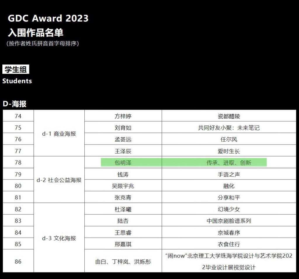 近日,公司师生在多项权威设计类大赛中获奖,崔浩教授编著的《翩若惊鸿》一书获第十届全国书籍设计艺术展览优秀奖,视觉传达设计专业包明泽同学创作的海报作品《传承、进取、创新》成功入围2023年全球设计大赛(GDC)的设计奖。